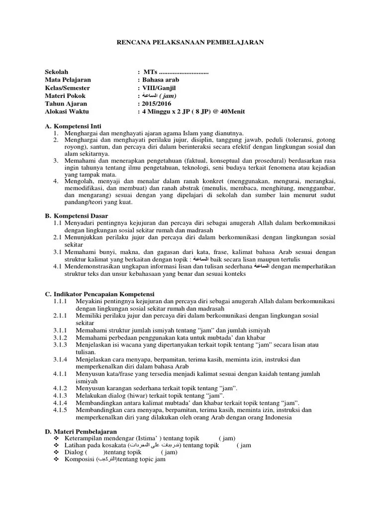 Rpp bahasa arab mts kurikulum 2013 kelas 7 8 9 edisi revisi 2017 ini merupakan perangkat .